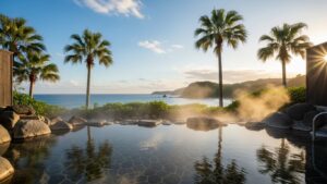 宮崎に到着してまず心を奪われるのが、どこまでも続く青い空とヤシの木が並ぶ風景です。一気にリゾート気分が高まりますが、今回の主役はあくまで「温泉」。宮崎の温泉は、海沿いの絶景露天から山あいの静かな秘湯まで、実に多彩です。